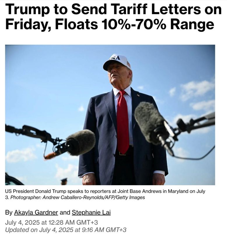 Речь идет о «взаимных» тарифах, ранее сниженных до 10% на 90 дней для ведения переговоров. Если соглашения не достигнуты – тарифы автоматически вступают в силу.