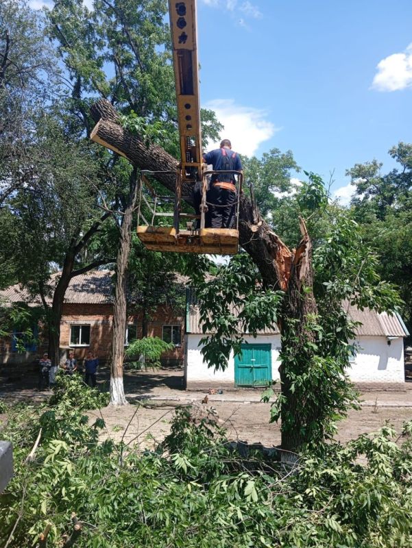 В рамках сотрудничества специалисты предоставили городу автовышку для обрезки деревьев на территории детского санатория.