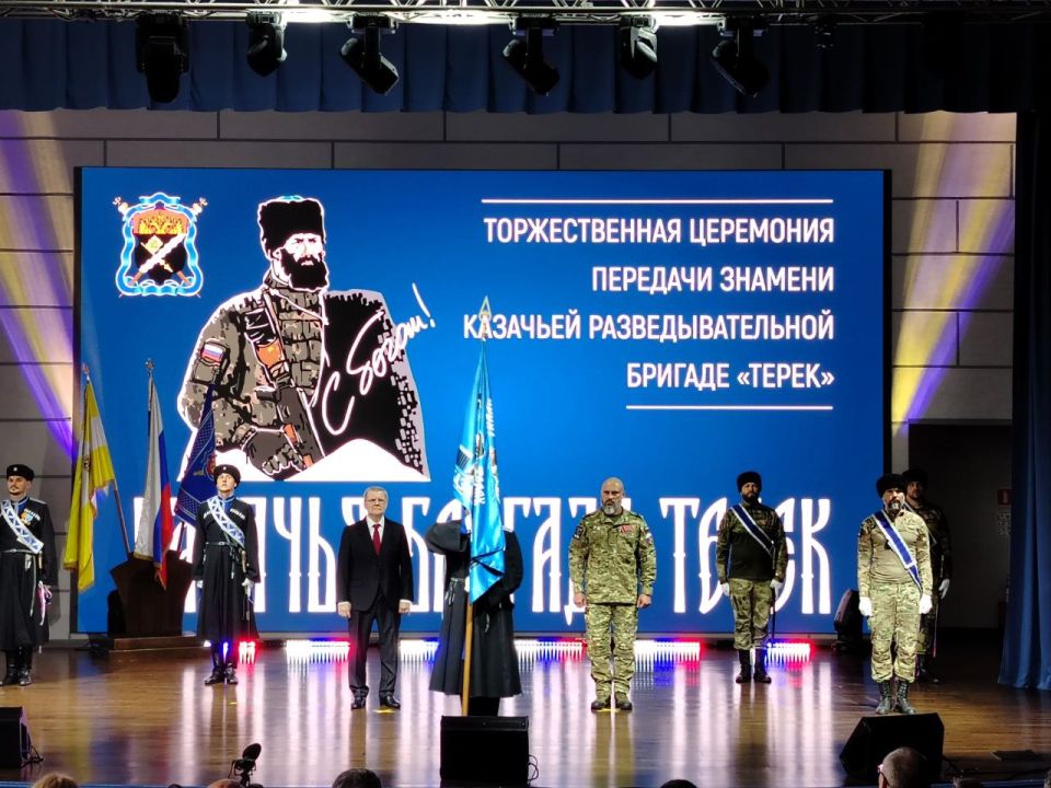 Казачьей разведывательной бригаде «Терек» в торжественной обстановке передали знамя, которое подписал Президент Российской Федерации Владимир Владимирович Путин.
