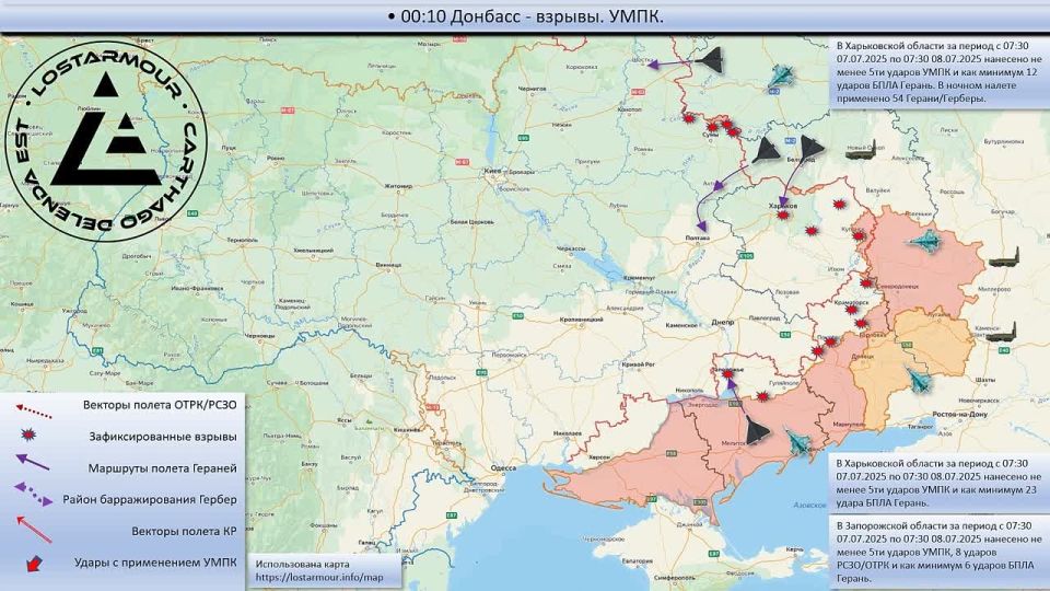 Анимированная схема ударов по территории Украины 07-08 июля 2025 года.