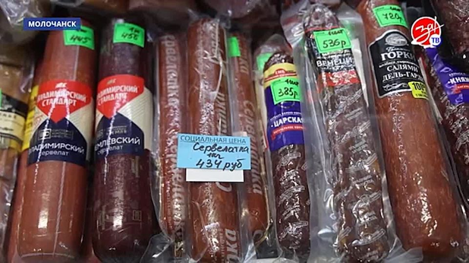 В магазине, расположенном в центре Молочанска, есть в наличии социальные продукты — молоко, колбасы, рыба, макаронные изделия, яйца, чай, сахар. Покупатели могут выбрать подходящий товар в широком ценовом диапазоне. Сроки годности продуктов также подлежат проверке. В торговом зале людно. Покупатели есть во всех отделах.