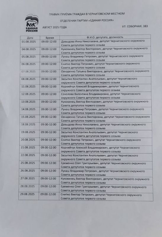 Черниговским местным отделением политической партии «Единая Россия» сформирован график приёма граждан на август 2025 г.