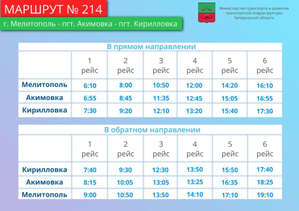 Министерство транспорта и развития транспортной инфраструктуры Запорожской области информирует об изменениях в расписании движения автобусов на маршруте № 214 «г. Мелитополь - пгт. Акимовка - пгт. Кирилловка», которые вступили в силу с 29.07.2025.