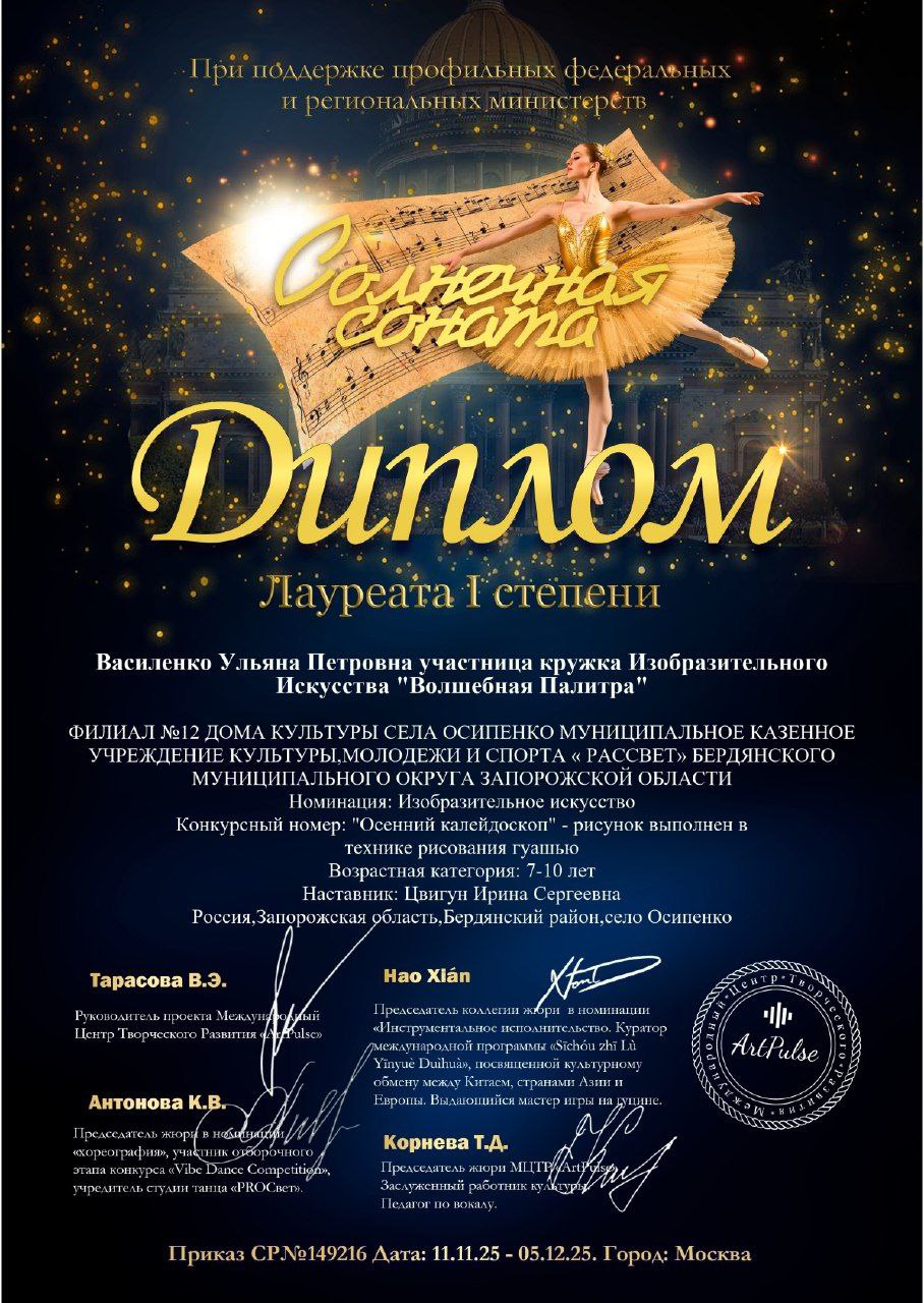 Воспитанница кружка изобразительного искусства «Волшебная палитра» (филиал №12 дома культуры села Осипенко) Василенко Ульяна добилась впечатляющих результатов на престижных творческих состязаниях. Юная художница стала лауреатом 1 степени на международном конкурсефестивале «Солнечная соната» и Всероссийском многожанровом конкурсефестивале «Отчизна моя — гордость моя» с работой «Осенний калейдоскоп». Кроме того, Ульяна приняла участие во Всероссийской просветительской конференции «Триумф искусства», расширив свой творческий кругозор и обменявшись опытом с единомышленниками.