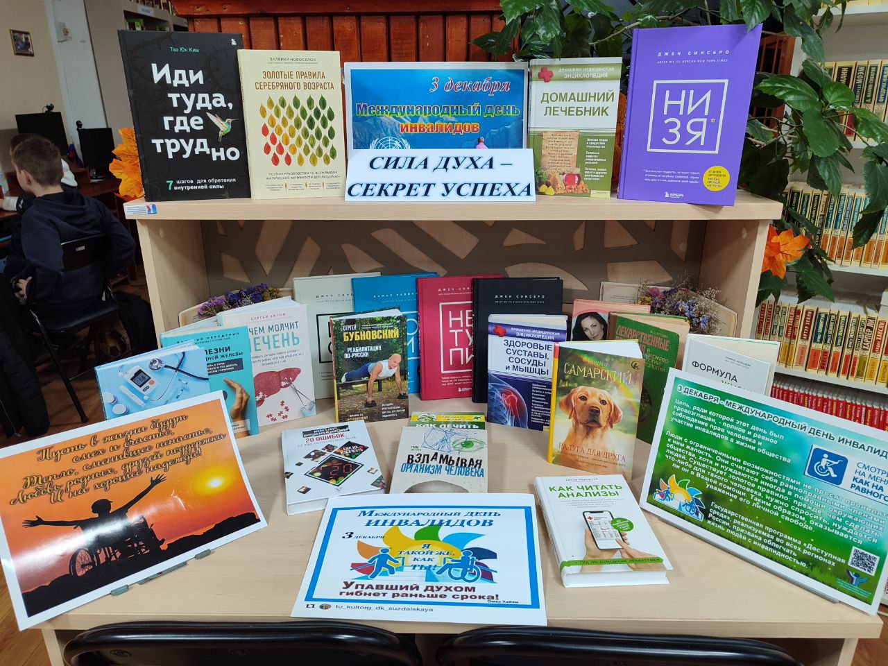 К Международному дню инвалидов в Токмакской городской библиотеке-филиале открыта книжная выставка «Сила духа – секрет успех», на которой представлена тематическая подборка литературы