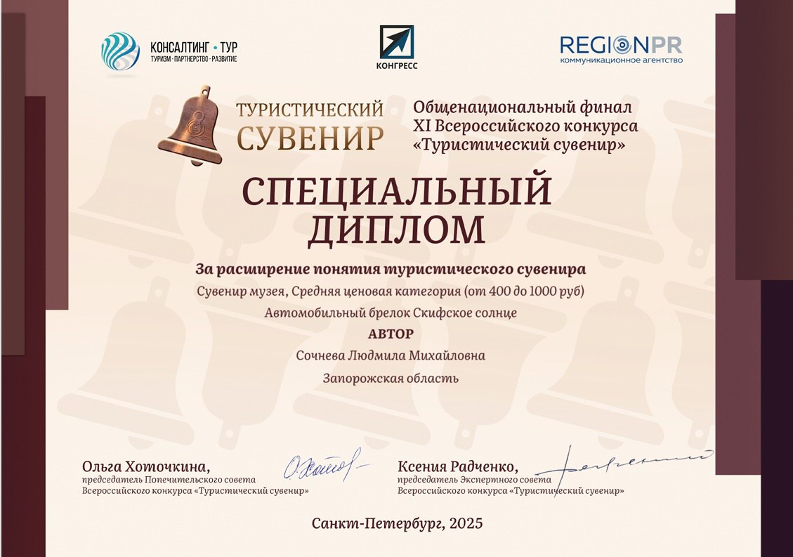 Запорожскую область в финале конкурса представляли 3 сувенира. Специальный диплом за расширение понятия «Туристический сувенир» в номинации «Сувенир музея» получила мастерица из Запорожской области Людмила Сочнева за свой уникальный сувенир «Скифское солнце».