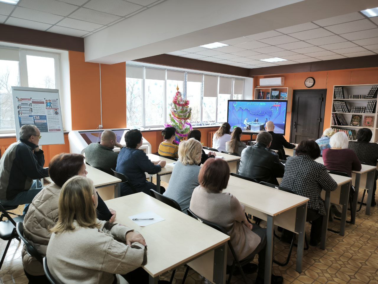 В центральной городской библиотеке г.Токмак собрались коллективы централизованной бухгалтерии учреждений культуры, библиотеки, городского Дома культуры для просмотра эфира программы, чтобы услышать с первых уст главные заявления главы государства.