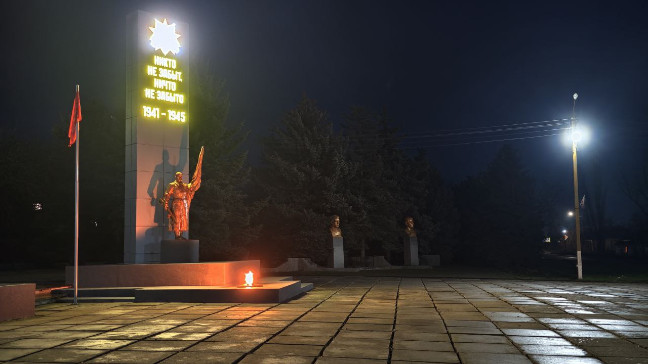 Ночной памятник воинам-односельчанам, которые не вернулись с полей сражений Великой Отечественной войны «Никто не забыт, ничто не забыто» в пгт Андреевка Бердянского района.