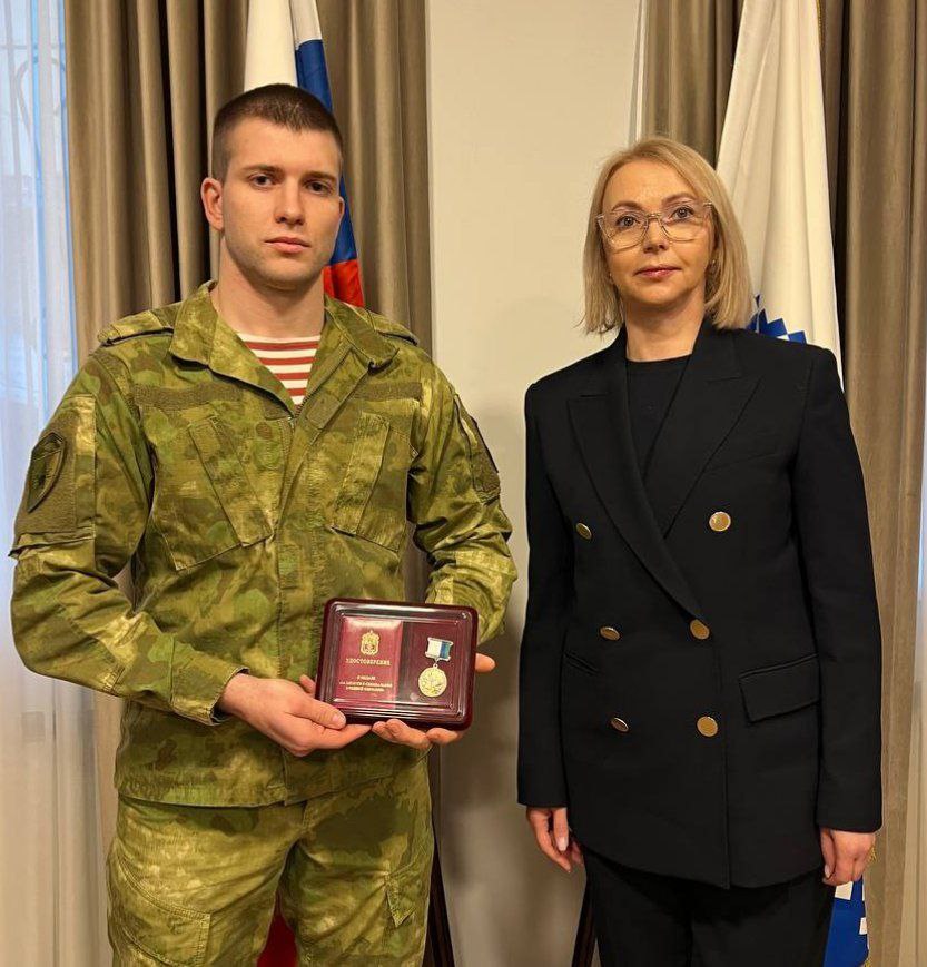 Сегодня вручила медаль «За заслуги в специальной военной операции» ефрейтору Дмитрию Шабанову. Парню 27 лет, но у него уже есть несколько боевых наград, включая медаль Жукова. Во время специальной военной операции Дмитрий раскрыл множество схронов с боеприпасами, помогал в защите мирного населения.