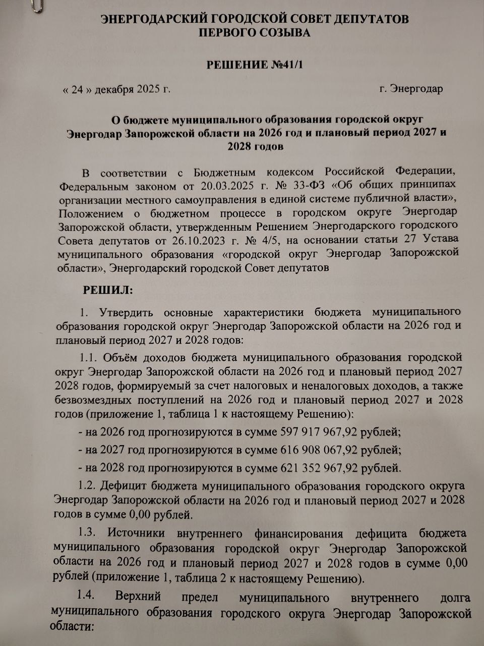 Максим Пухов: Принят главный финансовый документ - бюджет Энергодара на 2026 год