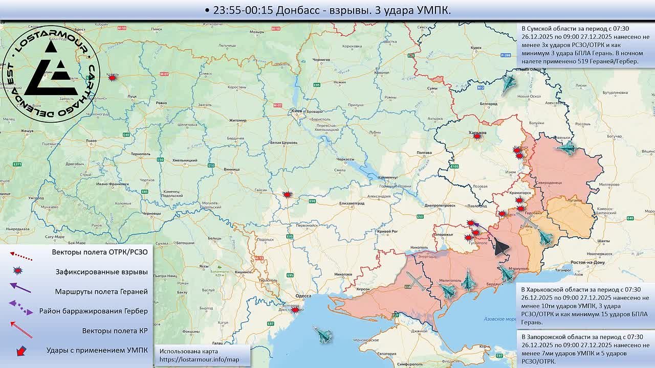 Анимированная схема ударов по территории Украины 26 декабря – 27 декабря 2025 года