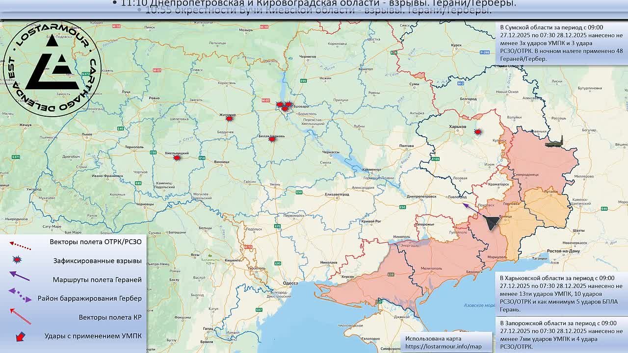 Анимированная схема ударов по территории Украины 27 декабря – 28 декабря 2025 года