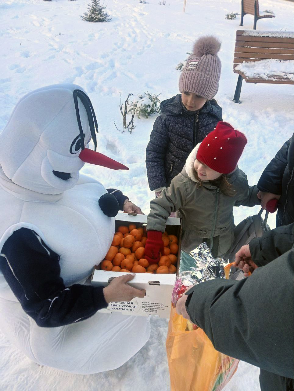 Сегодня возле новогоднего «Морозобуса» Деда Мороза и Снегурочки наш весёлый снеговичок раздавал жителям солнечные мандарины — вкусный подарок от братского народа Абхазии