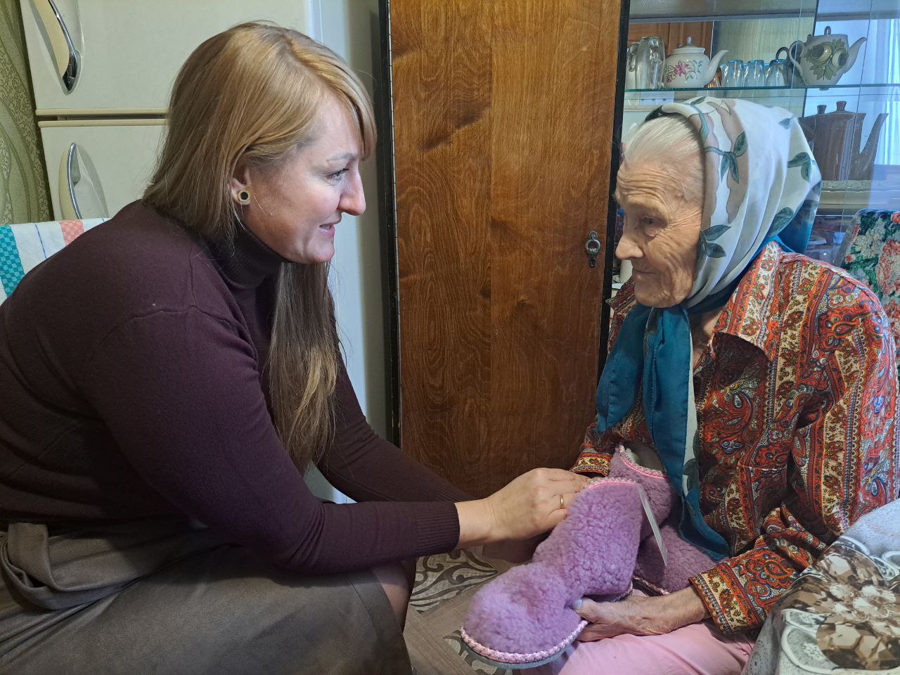 Виктория Викторовна выразила благодарность за вклад, который женщина внесла в Великую Победу, за труд в военные и послевоенные годы, поздравила с наступающими новогодними праздниками, пожелала крепкого здоровья и вручила подарки.