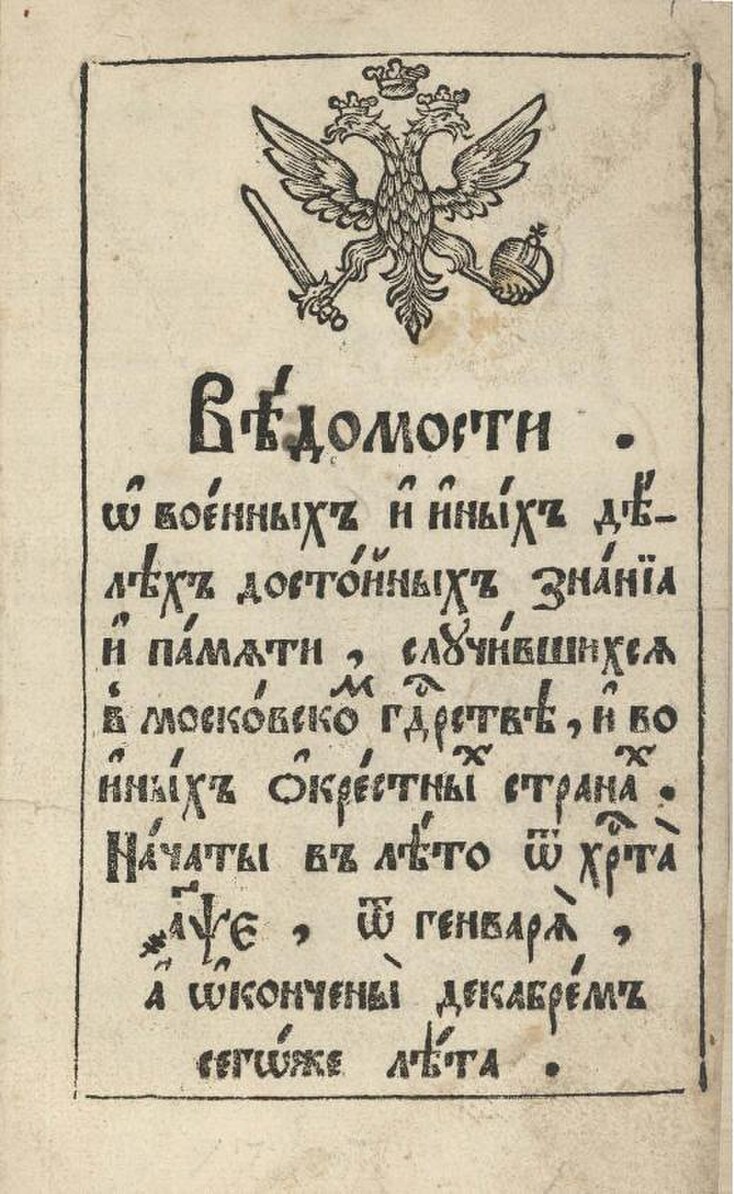 Полное название первого выпуска было «Ведомости о военных и иных делах, достойных знания и памяти, случившихся в Московском Государстве и во иных окрестных странах».В 1992 году в честь этого события был учреждён День российской печати.