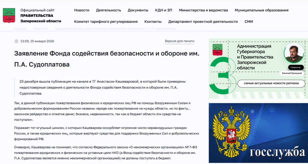 Фонд содействия безопасности и обороне им. П.А. Судоплатова выступил с официальным опровержением заявлений, сделанных в телеграм-канале Анастасии Кашеваровой 23 декабря.