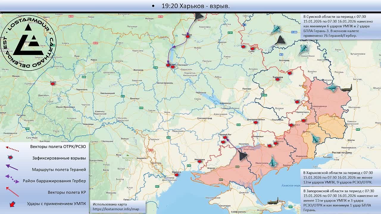 Анимированная схема ударов по территории Украины 15 января 2025 – 16 января 2026 года.