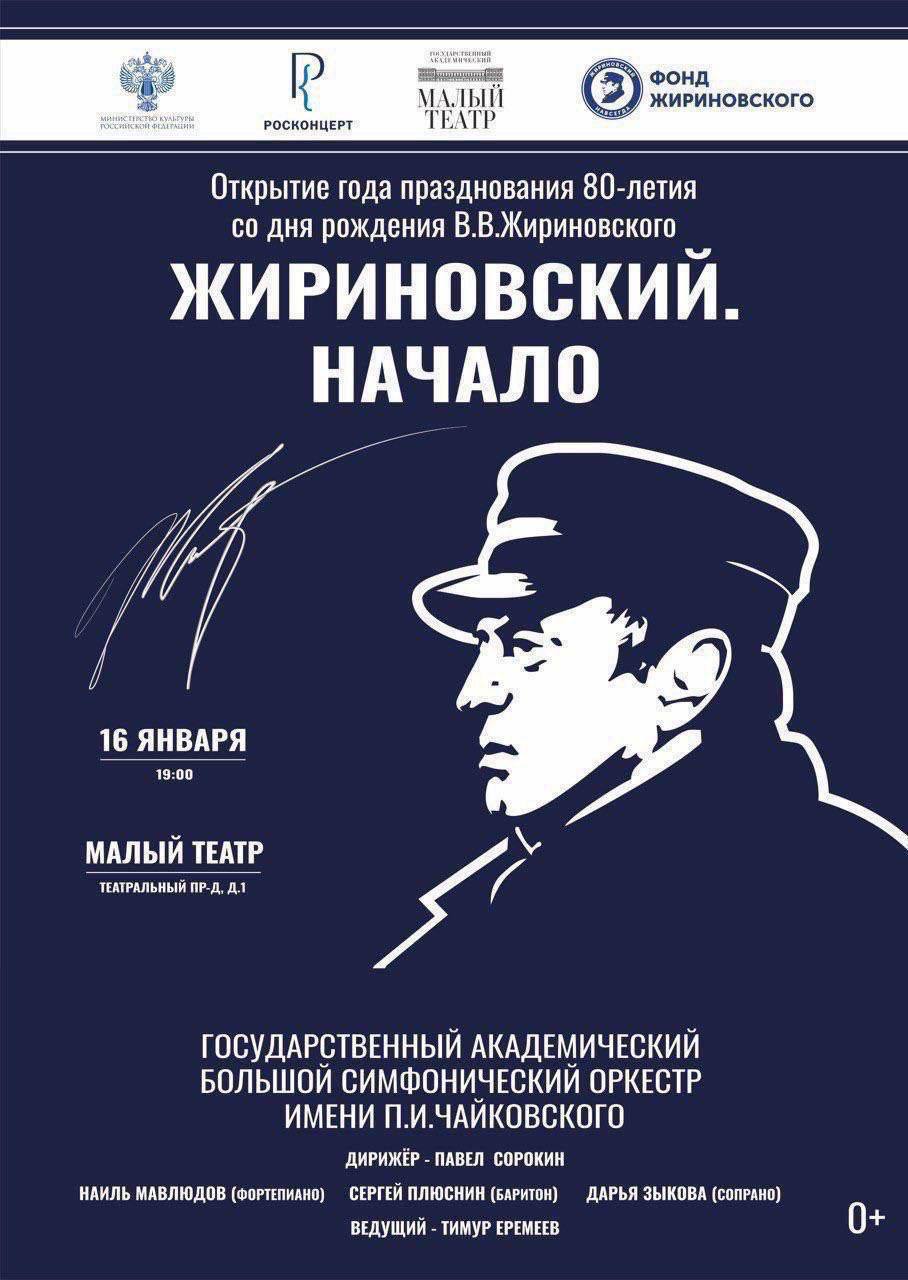 А сегодня в историческом центре Москвы на Исторической сцене Малого театра состоится историческое открытие «года Жириновского», в ознаменование чего Большим симфоническим оркестром им. П.И.Чайковского и заслуженными артистами России будет исполнена концертная программа «Жириновский. Начало». В честь легендарного политика, который при жизни во многом стал первым и в этом качестве вошёл в историю современной России, прозвучат шедевры великих русских композиторов, также когда-то ставшие первыми в своём роде и прославившие русскую культуру на весь мир.