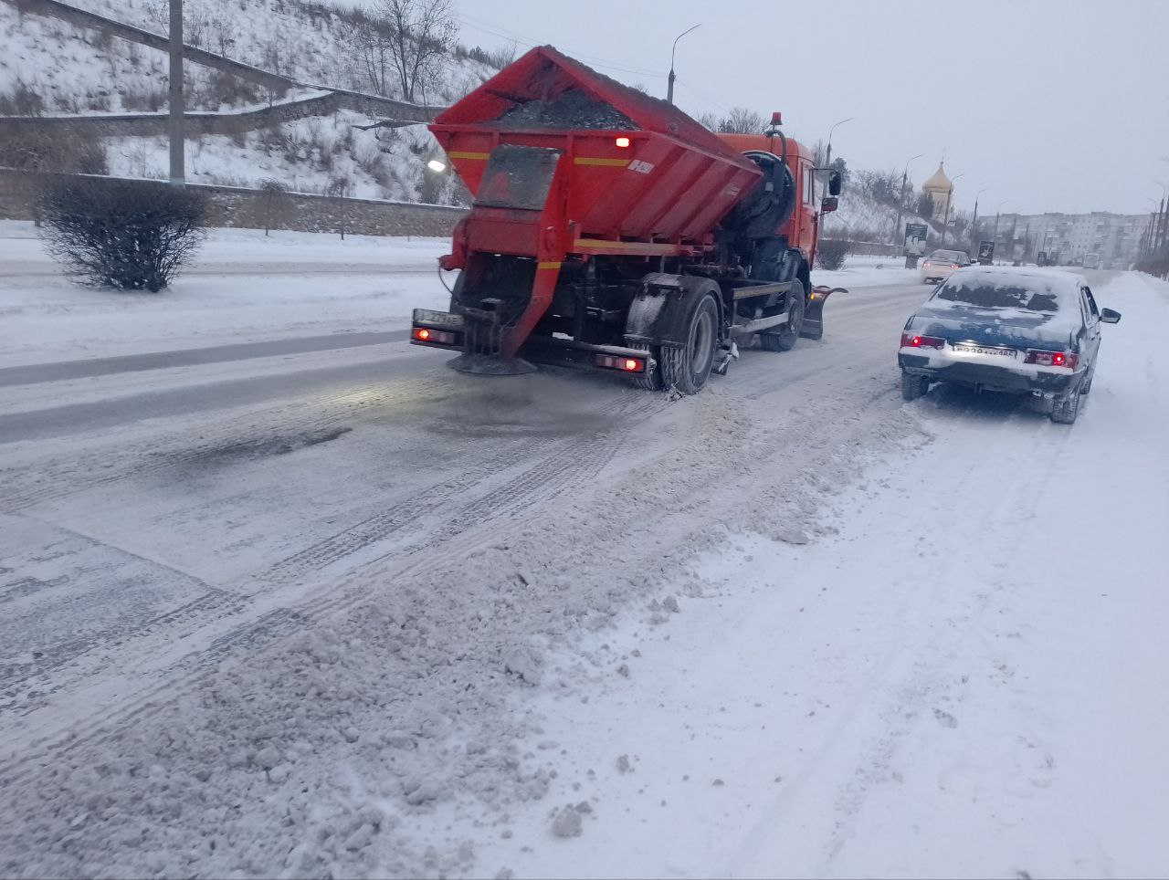 Несмотря на завершение рабочего дня, техника коммунальных служб продолжает расчистку и посыпку автомобильных дорог Бердянска.