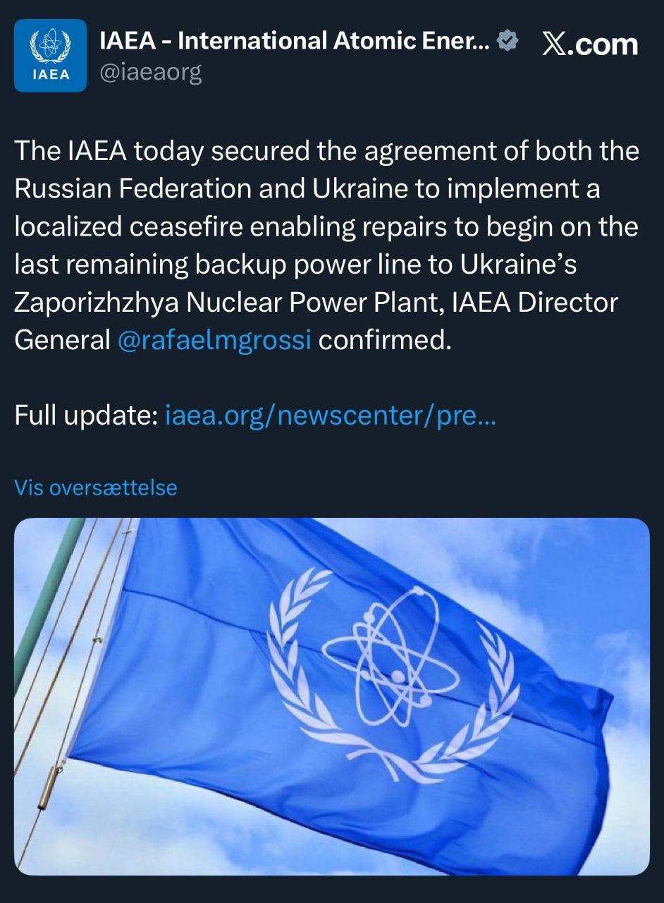 МАГАТЭ объявило, что Россия и Украина договорились о локализованном прекращении огня, чтобы позволить провести ремонт последней оставшейся резервной линии электропередачи, снабжающей Запорожскую атомную электростанцию