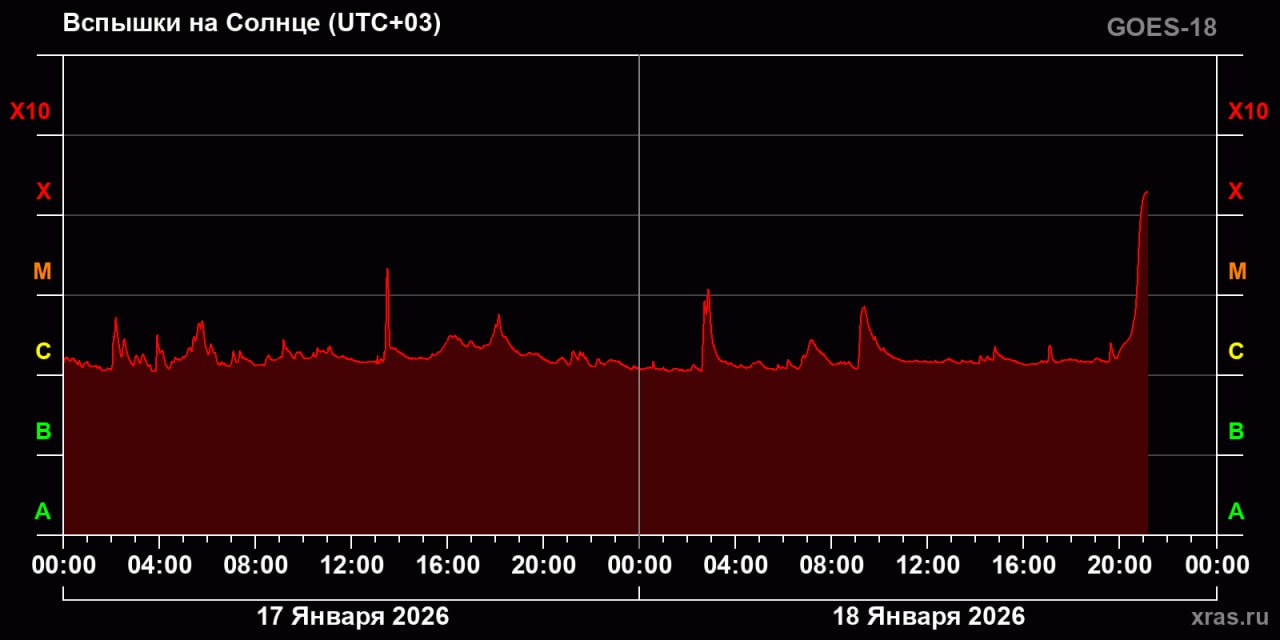 Как сообщили в Лаборатории солнечной астрономии ИКИ РАН, вспышка балла Х достигла максимума в 21:09 по мск. Во вторник прогнозируются очень сильные магнитные бури, ожидающийся уровень— G3/G4.