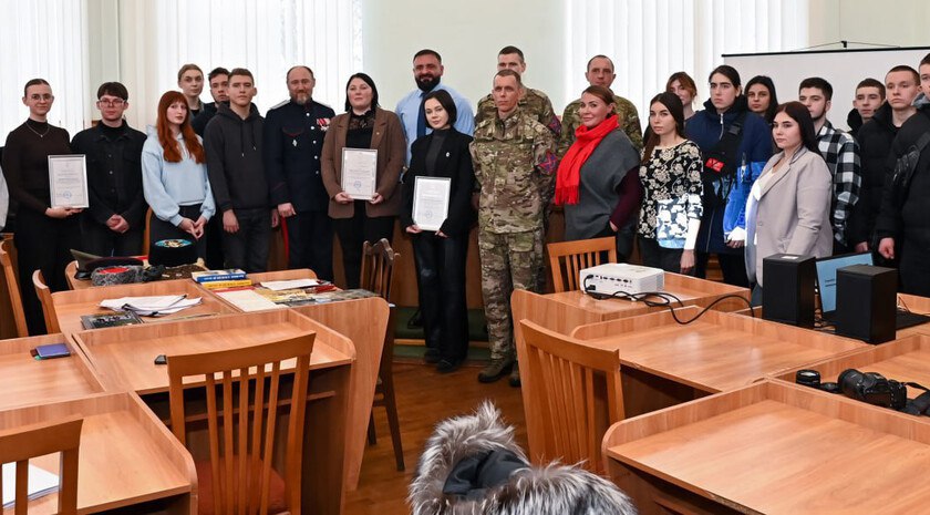 Перед студентами выступил заместитель председателя профильного комитета Законодательного собрания области Олег Слюсаренко и депутат, участник СВО Сергей Юрченко.