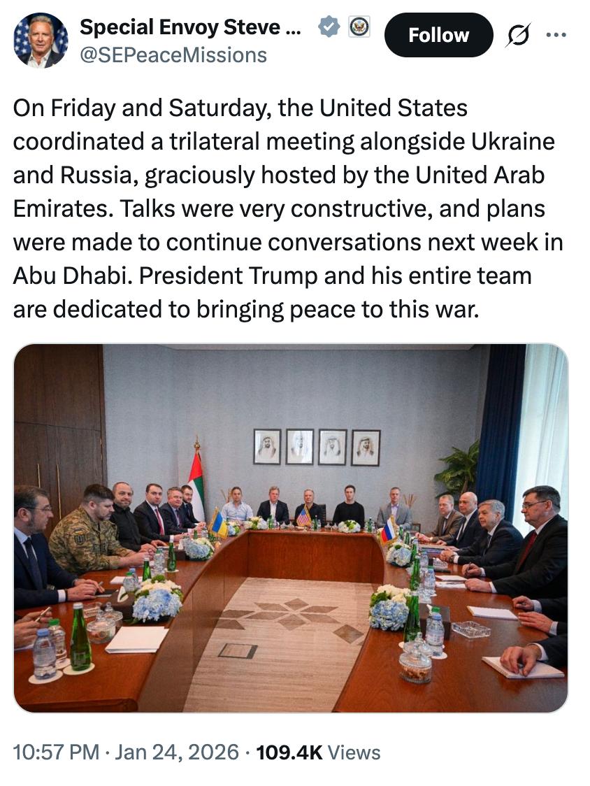 Уиткофф назвал продуктивными прошедшие в Абу-Даби трехсторонние переговоры по Украине и подтвердил планы провести новый раунд встреч на следующей неделе.