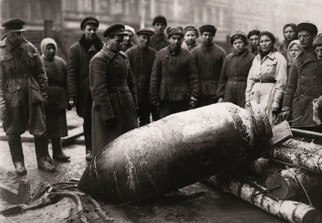 Жители блокадного Ленинграда столпились вокруг гигантской немецкой авиабомбы SC-1000, которая, к счастью, так и не разорвалась.