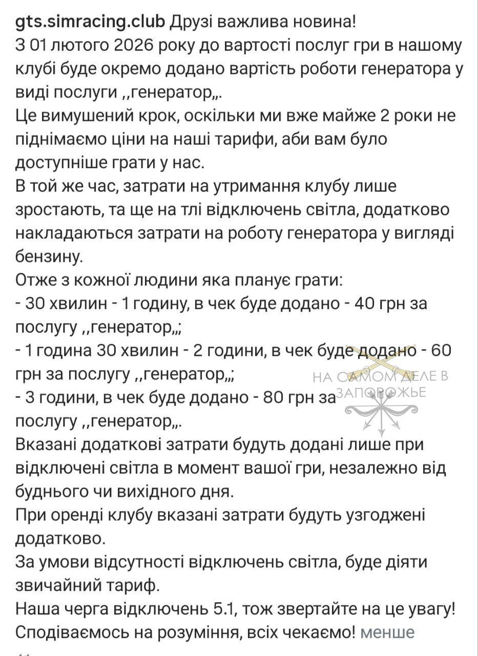 Игровой салон в Запорожье объявил о том, что теперь в стоимость услуг входит плата за работу генератора.