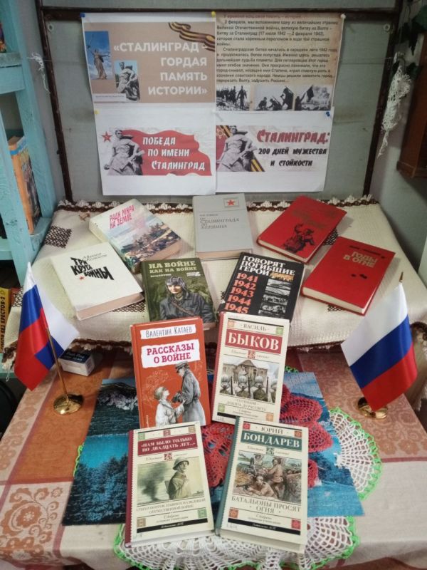 В Шелюговской библиотеке оформлена информационная выставка "Прорыв под Сталинградом", на которой размещены материалы о тех событиях и книги, рассказывающие о бессмертном ратном подвиге наших солдат в те 200 дней под Сталинградом.