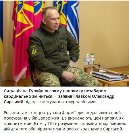 "Ситуация на Гуляйпольском направлении скоро кардинально изменится" — заявил главком ВСУ Сырский