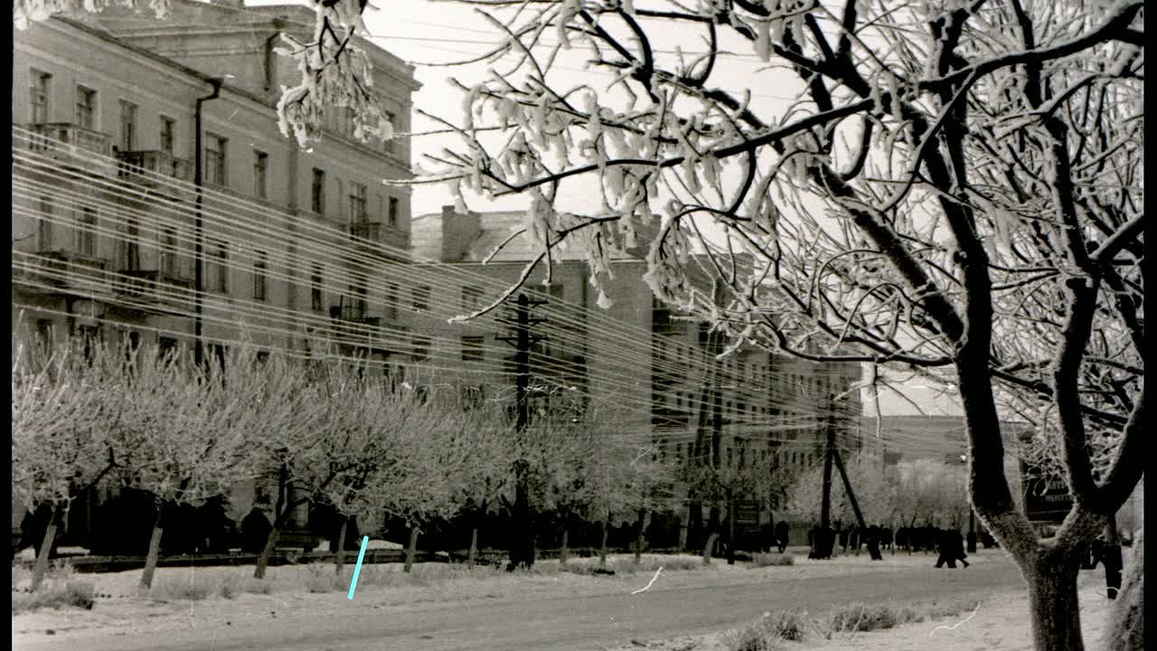на фото 1 - Главная улица нашего города – Революционная в начале 60-ых годов прошлого века. На фото видно проезжую часть из брусчатки, покрытую снегом, и 5-этажную новостройку из белого кирпича, на первом этаже которой будет открыт продуктовый магазин «Рыбка».