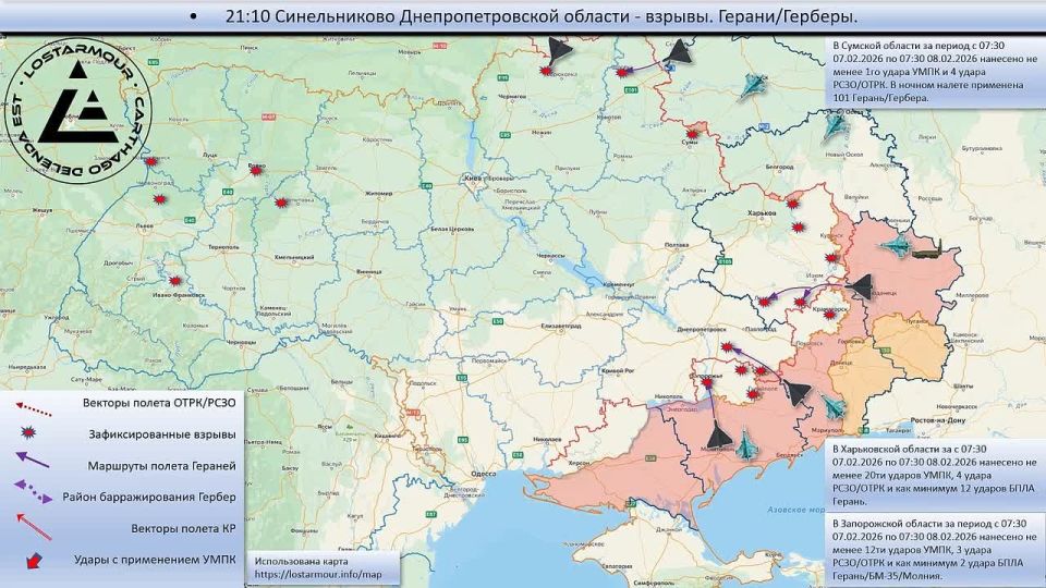 Анимированная схема ударов по территории Украины 07 февраля 2026 – 08 февраля 2026 года