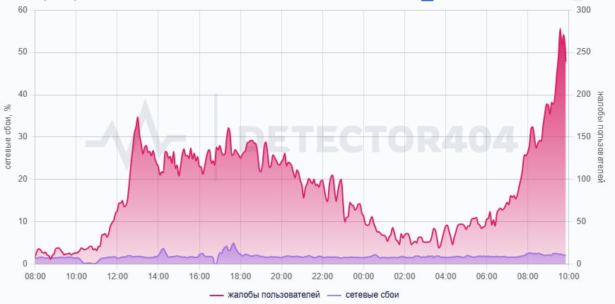 52% пользователей сообщают об общем сбое. Не работает мобильное приложение у 18%, не срабатывают оповещения у 17% пользователей, о сбое в работе сайта сообщает 10% пользователей.
