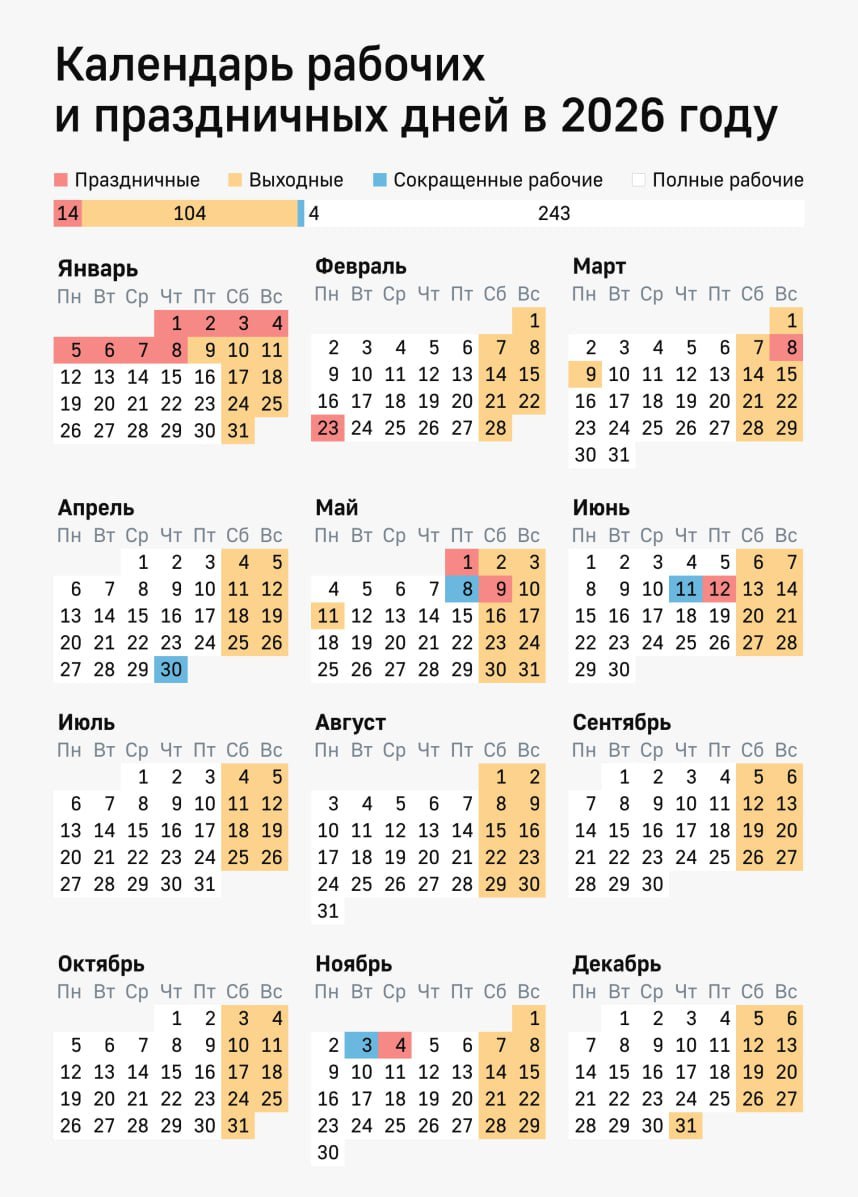 Они выпадут на 23 февраля, 9 марта, 1 и 11 мая, а также 12 июня, следует из утвержденного правительством производственного календаря.