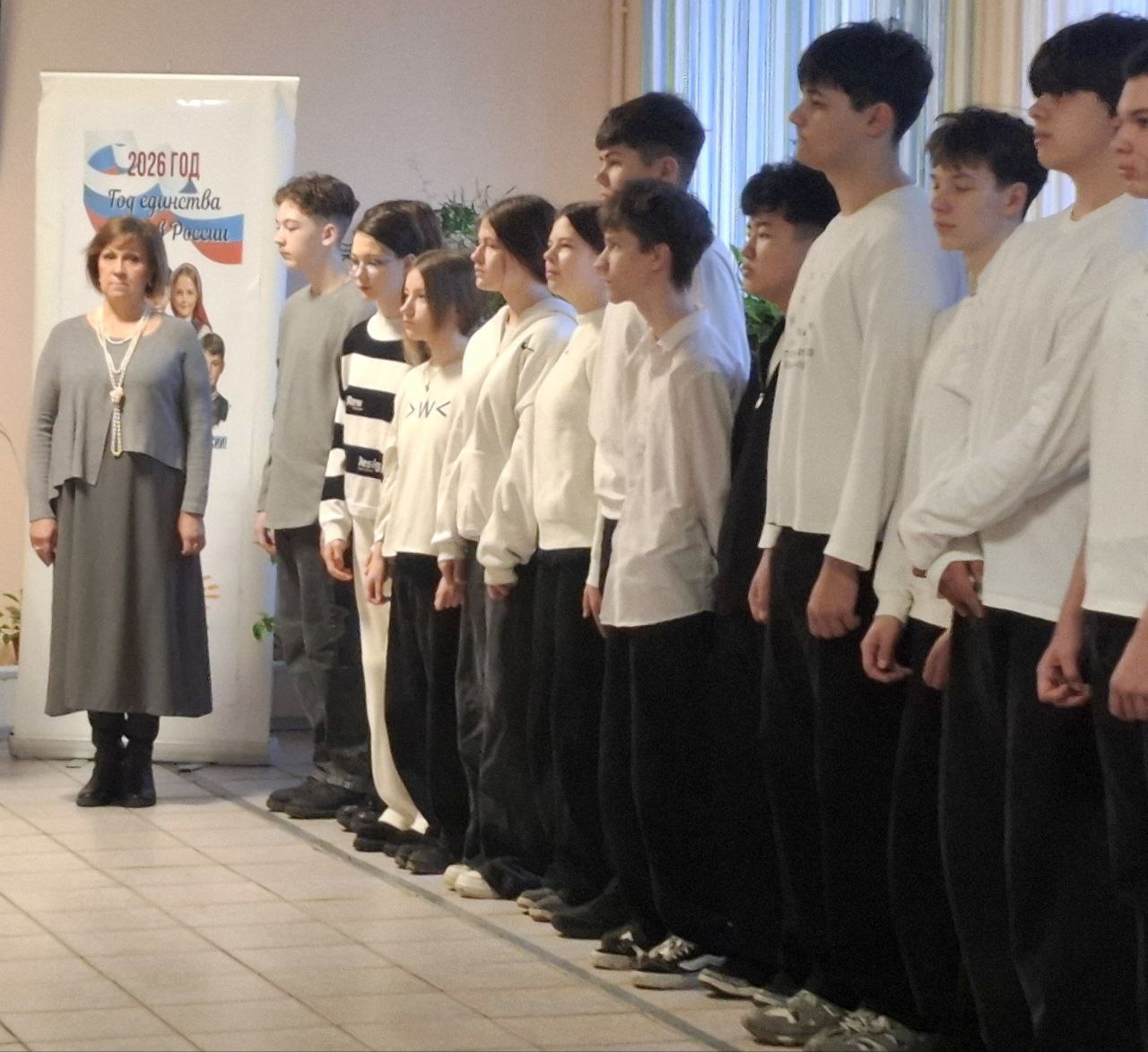 В ГБУ ОО ЗО «СОШ № 1 «София» города Днепрорудное 16 февраля 2026 года утро понедельника традиционно началось с торжественной линейки, церемонии выноса флага и исполнения гимна Российской Федерациии.
