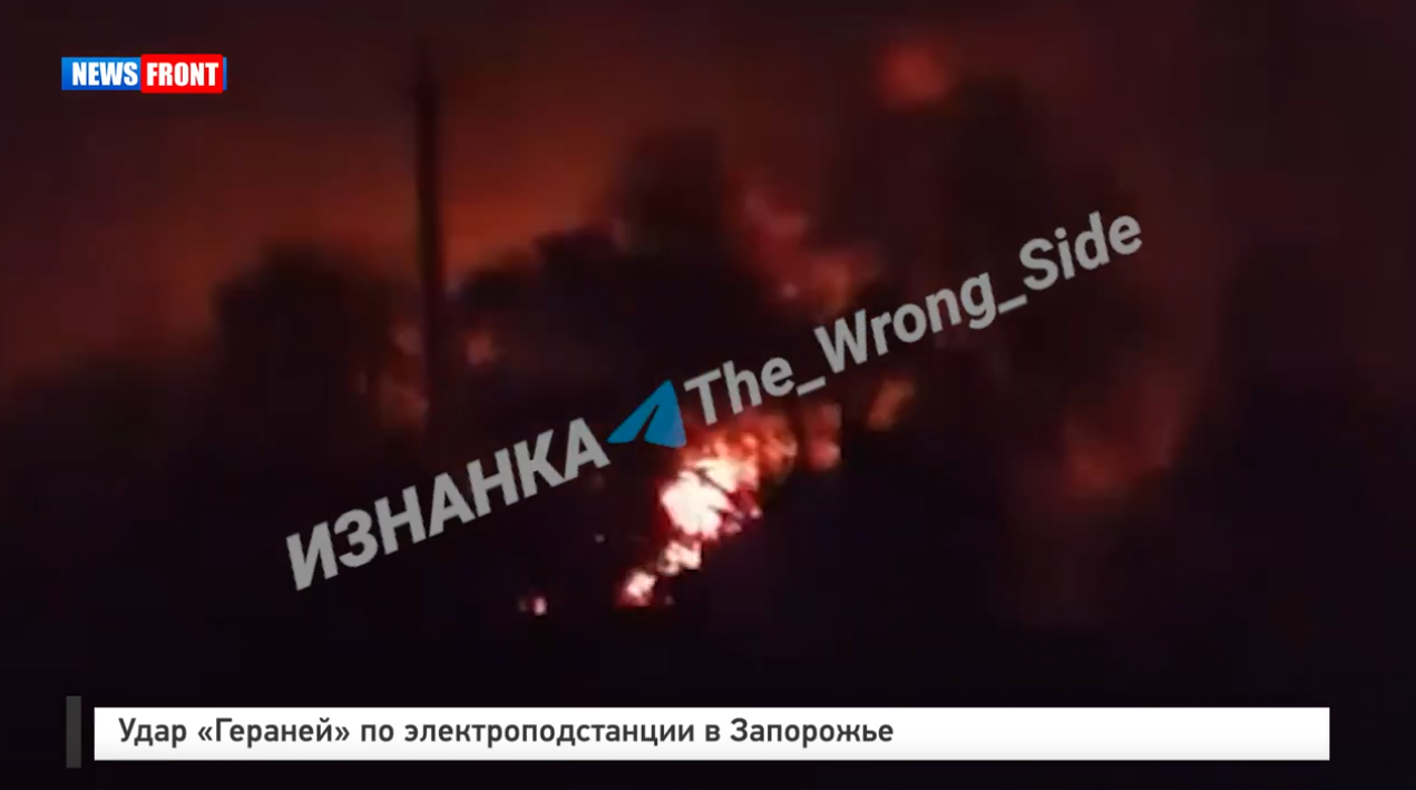 ВС России с помощью беспилотников «Герань?2» атаковали подстанцию «Александровская?2» в Запорожье. Кадры публикует Telegram-канал «Изнанка».