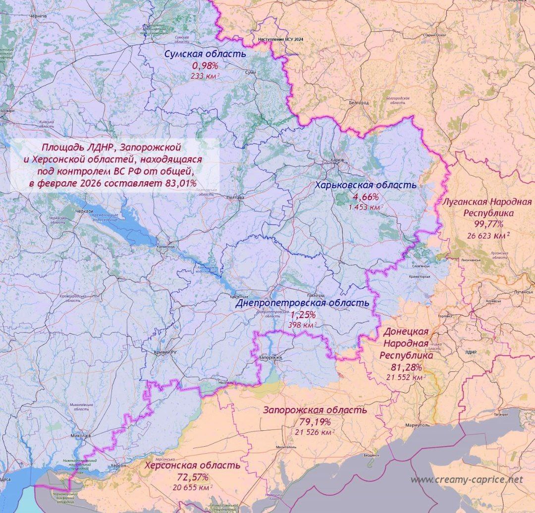 Процентное соотношение территорий областей и республик, находящихся под контролем ВС РФ к 25 февраля 2026 года