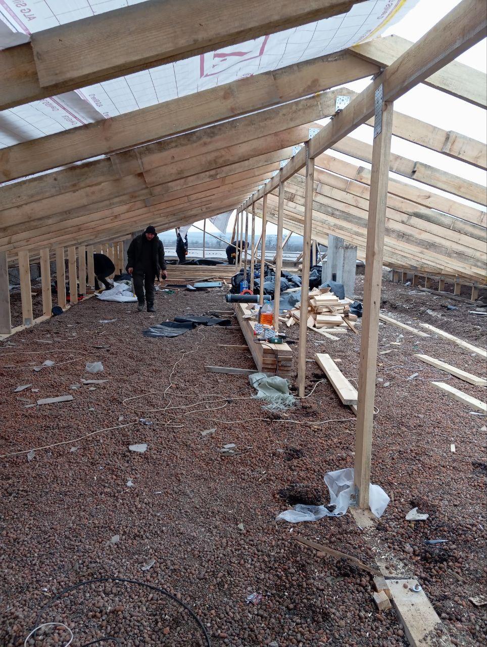 Подрядная организация доложила представителям Пензенской области о том, что на объекте смонтирована стропильная система, уложен гидроизоляционный материал. Сейчас идет монтаж контрбруса и обрешётки.