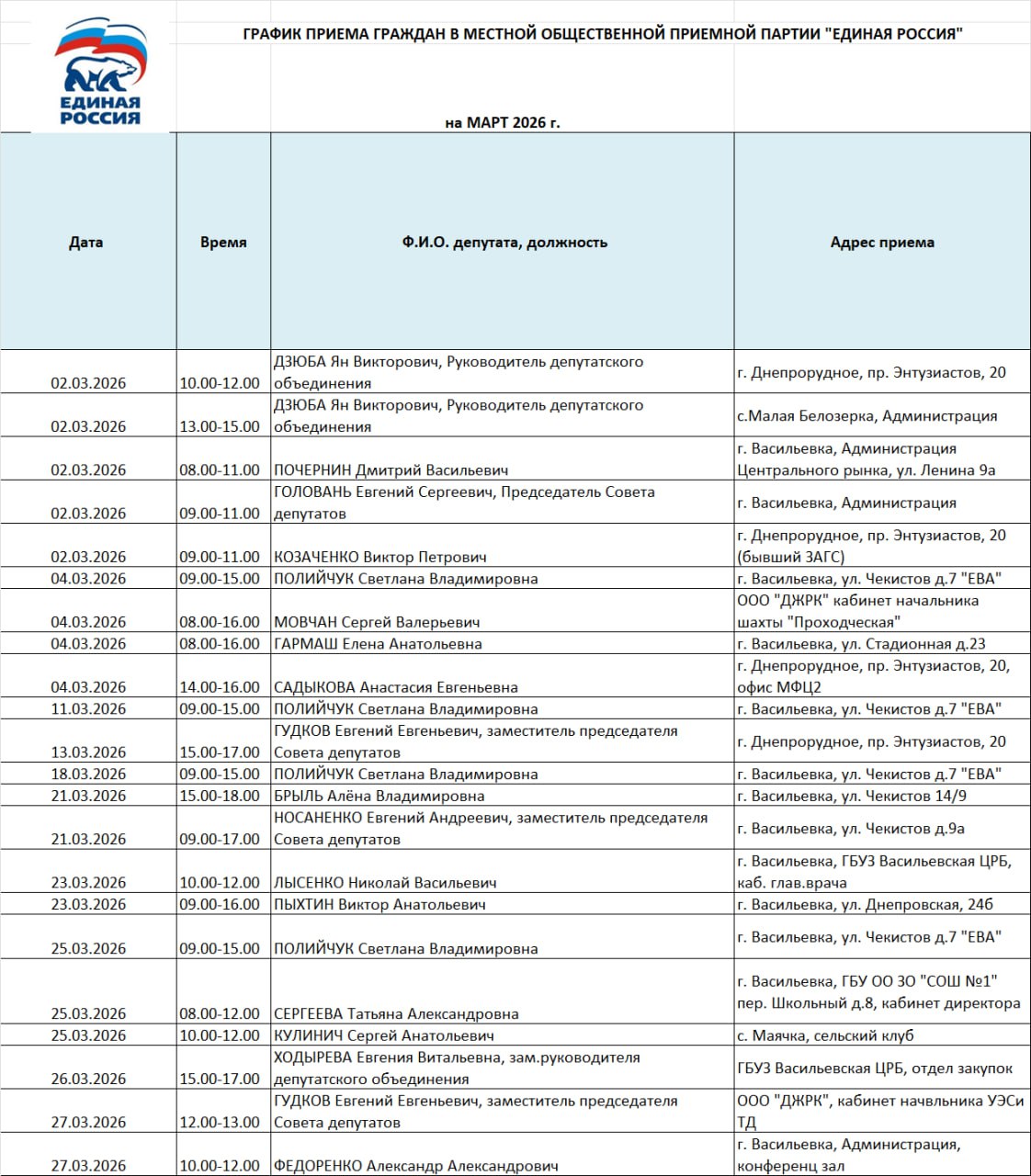 График приёма граждан на март 2026 года депутатами Васильевского окружного Совета депутатов от партии «Единая Россия»