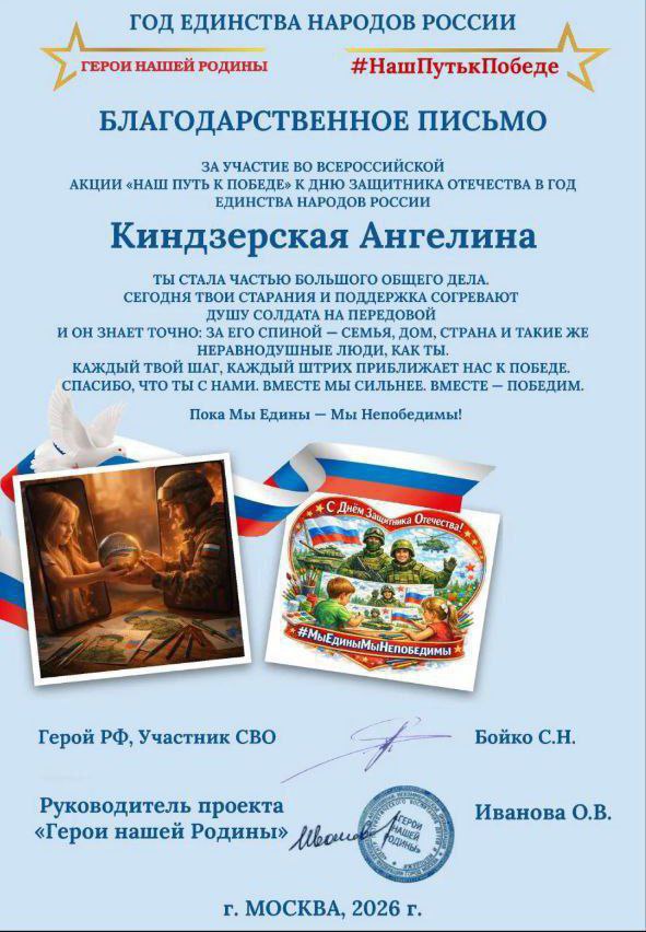 Новопетровский Дом культуры присоединился к всероссийской акции «Наш путь к Победе», приуроченной ко Дню защитника Отечества и Году единства народов России. Заведующая ДК села Новопетровка Кизым Виктория Андреевна вместе с участниками творческих кружков подготовила тёплые поздравления и слова поддержки для защитников Родины. Инициатива стала частью масштабного общенационального движения, направленного на укрепление морального духа военнослужащих и демонстрацию единства граждан страны.