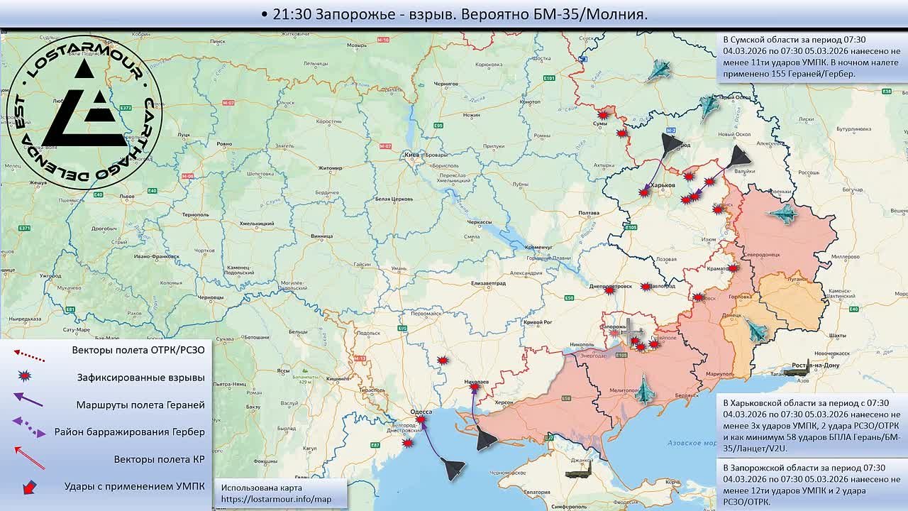 Анимированная схема ударов по территории Украины 04 марта 2026 – 05 марта 2026 года