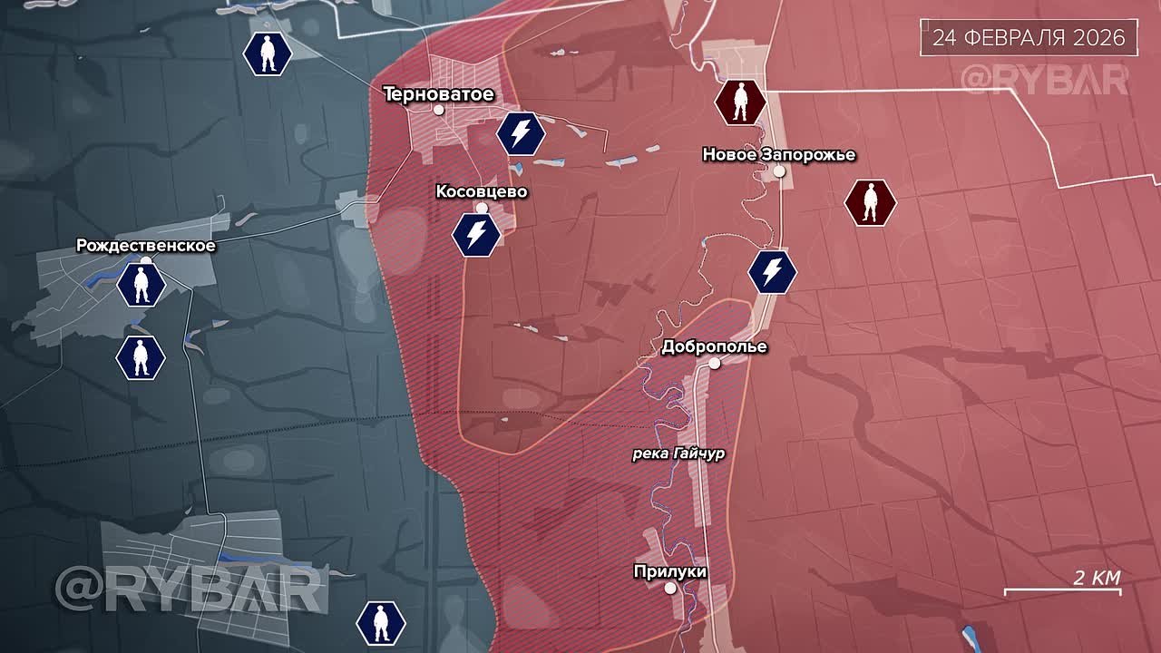На северном фланге противник к 14 февраля совершил рывок на технике из района Орестополя, прорвался через разреженные порядки ВС РФ и к концу месяца зацепился за окраины Березового и Тернового. Параллельно с этим ВСУ начали наступление ещё на одном участке фронта и к 27 февраля высадили десант на территории Вишнёвого и Вербового.