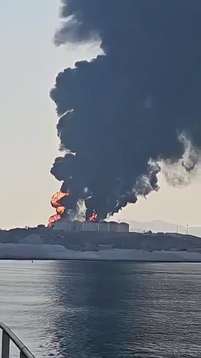 Топливные резервуары уже несколько часов полыхают в порту Омана. В соцсетях публикуют, как утверждается, последствия прилетов. В небо поднимается густой черный дым.