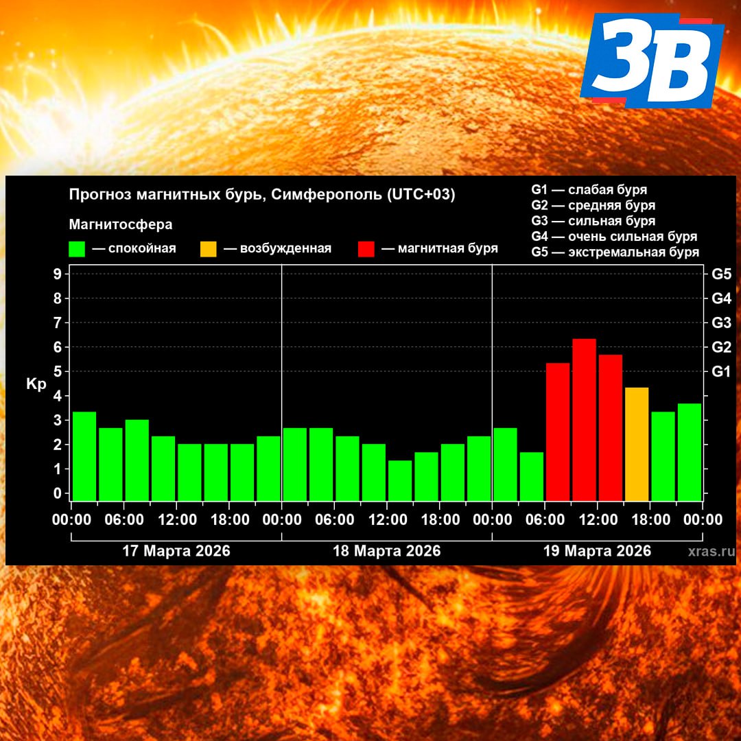 Магнитная буря уровня G2–G3 ожидается в четверг, 19 марта. Также высока вероятность полярных сияний.