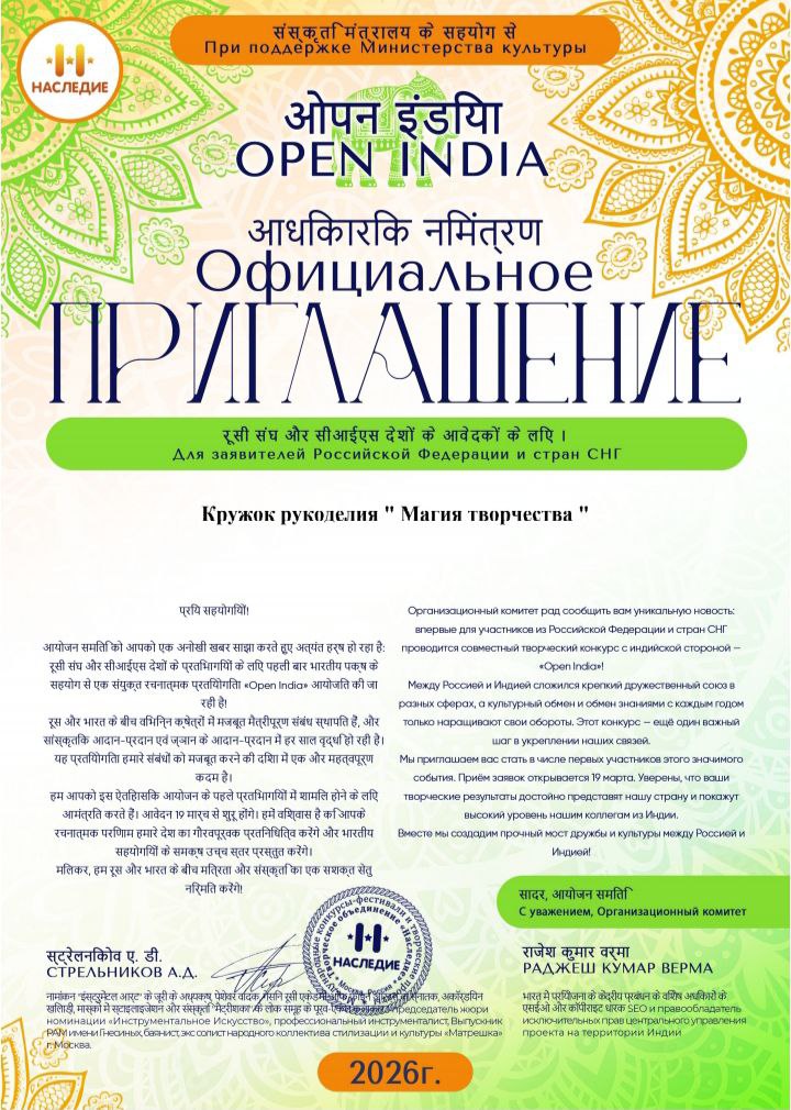 Руководитель кружка рукоделия «Магия творчества» Старопетровского Дома культуры Махнорылова Людмила Николаевна и её воспитанница Самойленко Александра получили официальное приглашение к участию в Международном российскоиндийском конкурсе. Мероприятие впервые открывается для стран СНГ и призвано укрепить культурные связи между государствами, а также предоставить творческим коллективам и исполнителям площадку для обмена опытом и демонстрации своих достижений.
