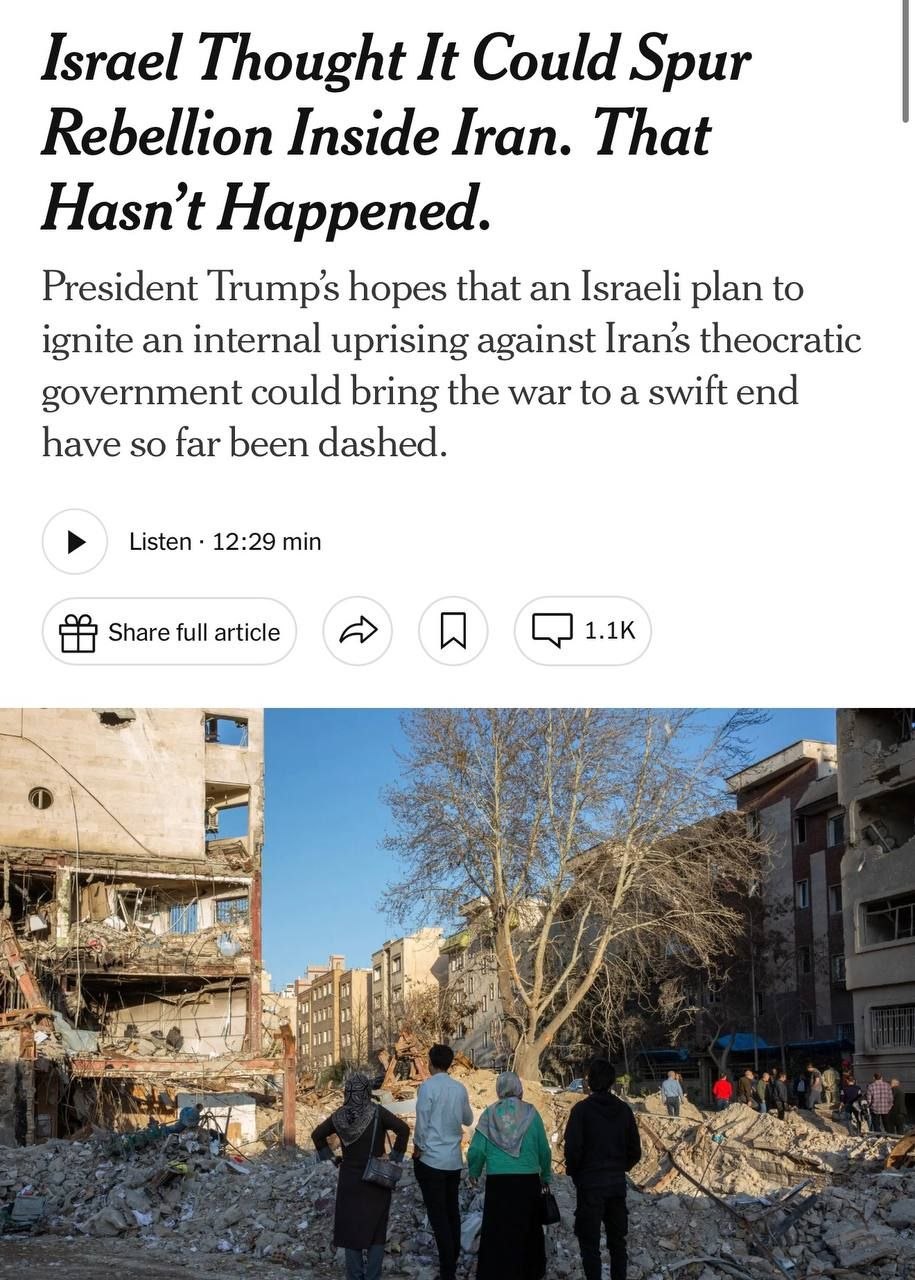 «Убежденность в том, что Израиль и США могут помочь спровоцировать массовое восстание, была ключевым просчетом в подготовке к войне, которая охватила весь Ближний Восток. Спустя три недели после начала войны восстания в Иране так и не произошло», — говорится в статье.