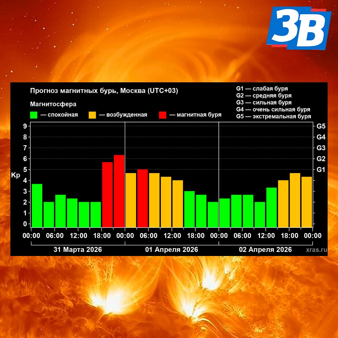 Магнитная буря уровня G2–G3 ожидается во вторник и среду, 31 марта и 1 апреля.