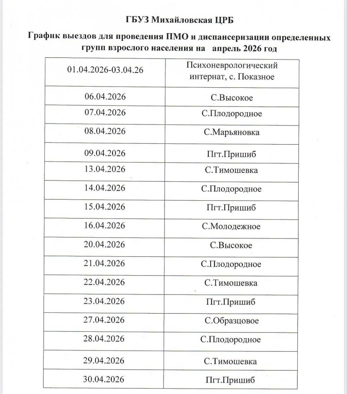 График ПМО и диспансеризации взрослого населения на апрель 2026 года