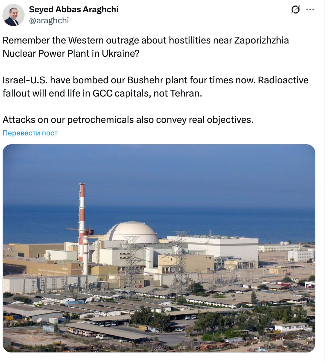 США и Израиль уже четыре раза нанесли удары по нашей станции в Бушере. Радиоактивные выбросы уничтожат жизнь в столицах стран Персидского залива, а не в Тегеране.